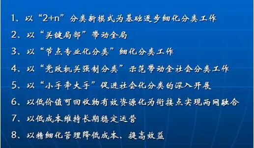 針對(duì)垃圾分類現(xiàn)狀及存在問題,陳海濱提出了推進(jìn)分類工作八條切入點(diǎn)/著力點(diǎn)。包括以2+N分類新模式為基礎(chǔ)逐步細(xì)化分類工作,以干濕分類為主,簡(jiǎn)化分類方式;以關(guān)鍵局部帶動(dòng)全局,分類主體的關(guān)鍵局部主要包含學(xué)生和干部;以節(jié)點(diǎn)專業(yè)化分類細(xì)化分類工作等。