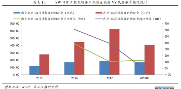 2018年民企融資陷入冰點(diǎn)。我們統(tǒng)計(jì)了SW環(huán)保工程及服務(wù)Ⅱ級公司的銀行借款情況,2018年前三季度國企和央企借款取得的現(xiàn)金規(guī)模171億元,同比增長13%;民營企業(yè)借款取得的現(xiàn)金規(guī)模407億元,同比下降2%??梢姡?018年國有企業(yè)從銀行借款未受到影響,但民營企業(yè)從銀行借款取得的現(xiàn)金規(guī)模明顯縮小。