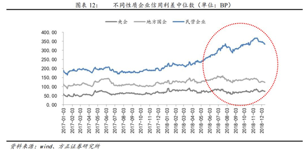 2018年民企融資信用利差持續(xù)擴(kuò)大。根據(jù)不同企業(yè)性質(zhì)的產(chǎn)業(yè)債信用利差統(tǒng)計(jì),2018年4月以來,民企信用利差持續(xù)擴(kuò)大,到11月中旬達(dá)到接近370BP,近期開始回落,目前利差水平約在350個BP。