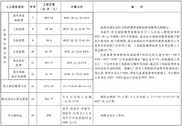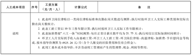 (二)環(huán)衛(wèi)用工成本指導價包括基礎(chǔ)工資、環(huán)衛(wèi)崗位津貼、環(huán)衛(wèi)工人工齡工資、高溫津貼、加班或者延長工作時間工資、國家法定節(jié)日和市環(huán)衛(wèi)工人節(jié)慰問金、社會保險(單位繳納部分)、住房公積金(單位繳納部分)8個部分,其他項目按照現(xiàn)有的法律、法規(guī)執(zhí)行。