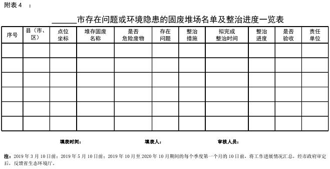 (二)制定整治方案階段(2019 年 4 月底前)。對(duì)排查發(fā)現(xiàn)存在問(wèn)題和隱患的堆存場(chǎng)所,按照誰(shuí)產(chǎn)生、誰(shuí)治理的原則,由責(zé)任主體單位制定環(huán)境整治方案,完善“防揚(yáng)散、防流失、防滲漏”措施,并報(bào)所在地生態(tài)環(huán)境部門(mén)備案。無(wú)法找到責(zé)任單位的,由當(dāng)?shù)厝嗣裾?fù)責(zé)治理。根據(jù)整治方案完善附表 4 相關(guān)內(nèi)容,2019年 5 月 10 日前,經(jīng)市政府審定后,反饋省生態(tài)環(huán)境廳。