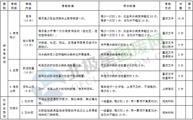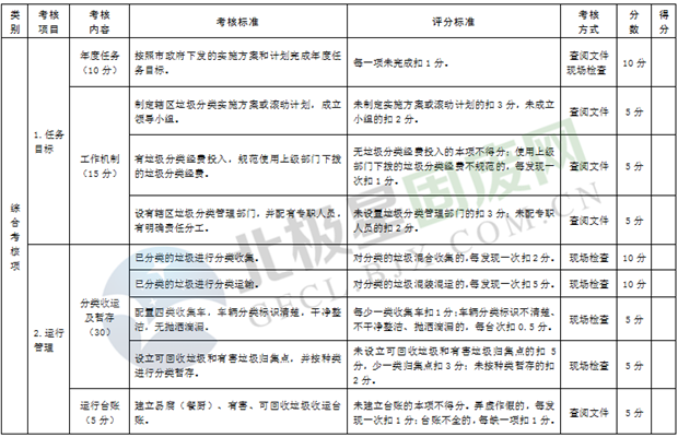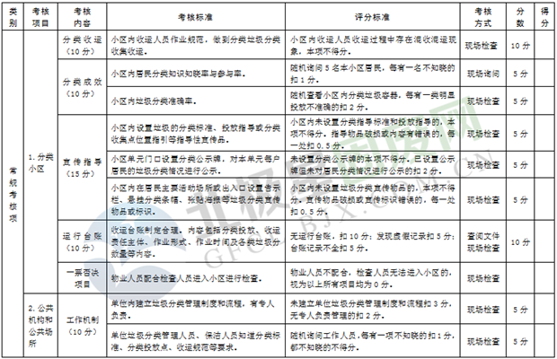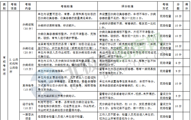 綜合考核:主要是考核各區(qū)市縣制度建設(shè)、運(yùn)行管理、宣傳培訓(xùn)、信息報(bào)送和日常檢查執(zhí)法等情況,由市垃圾分類(lèi)工作領(lǐng)導(dǎo)小組人員采取現(xiàn)場(chǎng)檢查和資料查閱等方式進(jìn)行。