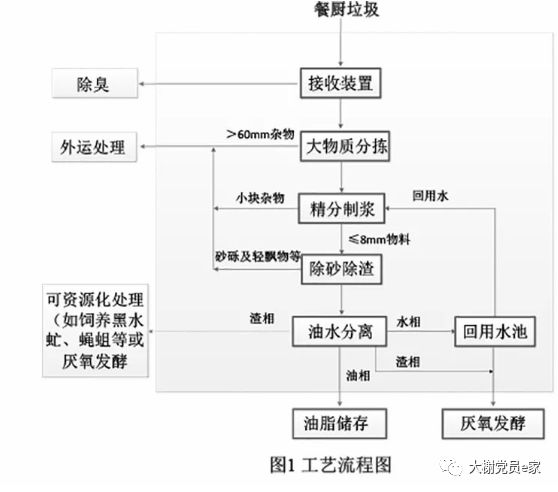 餐廚垃圾中的大塊金屬、瓷片、玻璃、塑料瓶蓋、貝殼、砂石、紙張等雜物被自動分揀出來,外運(yùn)至生活垃圾焚燒發(fā)電廠。漿液經(jīng)加熱后分離出三種狀態(tài)的物料-水相、渣相、輕相(油水混合物料)。其中從輕相物料中分離出來的粗油脂儲運(yùn)后可進(jìn)一步加工制成生物柴油,作為飛機(jī)燃料使用;渣相物料,一路與水相進(jìn)行調(diào)配做厭氧發(fā)酵,產(chǎn)生的沼氣可發(fā)電,另一路可用于資源化利用,如飼養(yǎng)黑水虻、蠅蛆等。