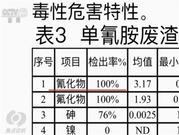由清華大學(xué)亞洲太平洋地區(qū)危險廢物管理培訓(xùn)與技術(shù)轉(zhuǎn)讓中心出具的具有法律效力的檢測報告中稱,這些的單氰胺廢渣,無機氰化物檢出率為100%,50個樣品中有11個氰化物浸出毒性超標(biāo),最大值超標(biāo)4倍。這就是說,這批廢渣已經(jīng)不是一般工業(yè)固體廢棄物,而屬于危險工業(yè)固體廢棄物,建議歸類為“HW38有機氰化物廢物”。