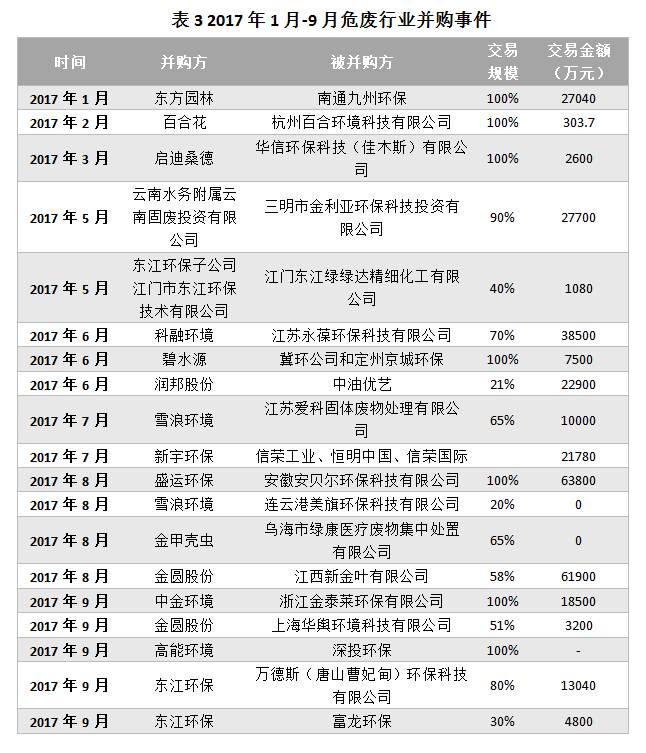 根據(jù)已有公開數(shù)據(jù)的不完全統(tǒng)計,截至2017年9月,2017年危廢行業(yè)發(fā)起并購行為19起起,累積交易金額32.46億元,并購方既包括像東江環(huán)保、啟迪桑德、新宇環(huán)保這樣的“行業(yè)老兵”,也不乏碧水源、盛運環(huán)保、中金環(huán)境等“后起之秀”,更有金圓股份等“跨界來者”。