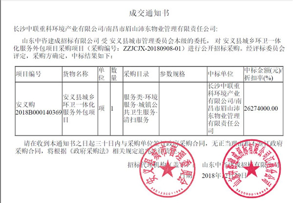 2018年12月29日,中聯(lián)環(huán)境成功中標(biāo)江西省安義縣城鄉(xiāng)環(huán)衛(wèi)一體化服務(wù)項目,中標(biāo)總金額約為2.38億元,服務(wù)期限5+3年,單年度服務(wù)費2627.4萬元。