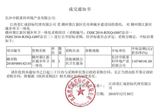 2018年12月30日,中聯(lián)環(huán)境成功中標(biāo)贛州蓉江新區(qū)城鄉(xiāng)環(huán)衛(wèi)一體化二標(biāo)段項目,該項目分兩期實施,首期當(dāng)年服務(wù)費約2300萬,服務(wù)期限5+3年,全生命周期總額約為3.8億元。