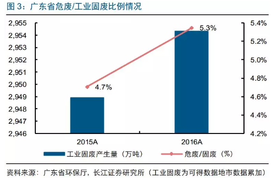 2015-2016年廣東省危廢占一般工業(yè)固廢的比例分別為4.7%及5.3%,其中深圳(32%)、中山(18%)、廣州(11%)、東莞產(chǎn)危量占一般工業(yè)固廢比例均超過5%,根據(jù)發(fā)達國家經(jīng)驗,該比例均值為3%,考慮到深圳、中山、廣州、珠海等地工業(yè)行業(yè)以產(chǎn)危比例較高的基礎化工、電子、石化為主,因此產(chǎn)危比例超過3%情理之中。其他地區(qū)比例較低或存低估可能,例如東莞、江門、佛山產(chǎn)業(yè)結構與深圳、珠海、中山相差無幾,茂名以石油開采為主,會產(chǎn)生大量的含油污泥,但其系數(shù)并沒體現(xiàn)。