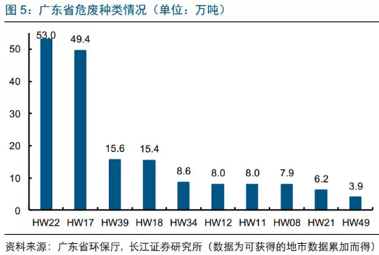 廣東省危廢種類中前5位的HW08(含油污泥,96.8萬噸,占總資質的20%)/HW22(含銅廢物,76.7萬噸,占總資質的15%)/HW17(表面處理污泥,56.3萬噸,占總資質的11%)/HW49(其他廢物,50.2萬噸,占總資質的10%)/HW48(有色金屬冶煉廢物,26.6萬噸,占總資質的5%)合計占總資質61%,危廢資質種類集中度高。