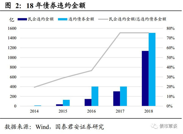 信用債市場(chǎng)出現(xiàn)大規(guī)模違約潮,共165只債券出現(xiàn)違約,總涉及金額1506.84億元,比2014-2017年4年違約債券金額總和還要多。而且本輪違約潮的主力軍是民營(yíng)企業(yè),在18年違約的債券中,發(fā)行人為民企的債券有126只,占違約債券總數(shù)的76.36%,涉及金額1136.19億元。事實(shí)上,在2016年也出現(xiàn)過類似的由于信用政策收緊而引發(fā)的違約潮,但相較于16年的違約事件,本輪違約潮的特征有所不同。