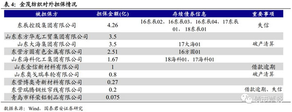 18年金茂自身主營(yíng)業(yè)務(wù)承壓的情況下,巨額對(duì)外擔(dān)保的風(fēng)險(xiǎn)暴露,導(dǎo)致企業(yè)流動(dòng)性緊張,最終出現(xiàn)違約。截至2018年6月末,金茂紡織對(duì)外擔(dān)保余額為19.33億元,占當(dāng)期期末凈資產(chǎn)的19.23%,擔(dān)保規(guī)模較大。被擔(dān)保企業(yè)主要是位于山東省東營(yíng)市的民營(yíng)企業(yè),區(qū)域較為集中,且所處行業(yè)集中在周期性較強(qiáng)的有色金屬、化工等行業(yè),在宏觀經(jīng)濟(jì)增速放緩的背景下,代償風(fēng)險(xiǎn)大,金茂紡織的對(duì)外擔(dān)保有極高的風(fēng)險(xiǎn)傳導(dǎo)性。被擔(dān)保企業(yè)山東大海集團(tuán)有限公司和奧戈瑞車輪集團(tuán)有限公司的信用風(fēng)險(xiǎn)已經(jīng)暴露:奧戈瑞于今年7月10日宣布進(jìn)入破產(chǎn)重組階段,公司為其擔(dān)保0.8億;11月26日,山東大海向東營(yíng)法院申請(qǐng)重整,金茂紡織為其擔(dān)保3.5億元。金茂紡織在尚且自顧不暇的情況下,又受巨額對(duì)外擔(dān)保的拖累,資金鏈斷裂,企業(yè)無法正常經(jīng)營(yíng)運(yùn)轉(zhuǎn),于在11月26日宣告破產(chǎn)重整。