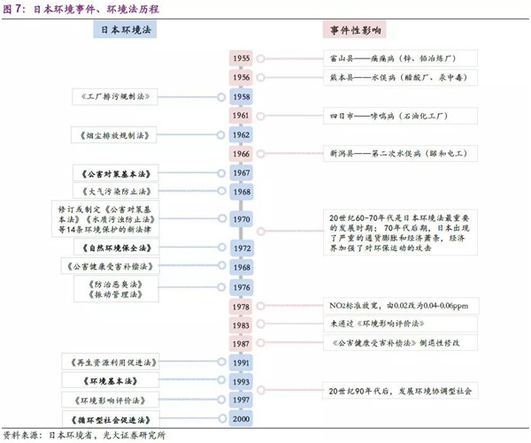 20世紀(jì)50-70年代,日本快速實(shí)現(xiàn)工業(yè)化,經(jīng)濟(jì)成就舉世矚目,但期間各類公害事件頻發(fā),成為了尖銳的社會(huì)和政治問(wèn)題。在此背景下,以1967年《公害對(duì)策基本法》為核心的環(huán)保法律體系應(yīng)運(yùn)而生,日本環(huán)保產(chǎn)業(yè)開(kāi)始了上升周期。雖然環(huán)保政策在80年代初經(jīng)濟(jì)下行時(shí)稍有反復(fù),但也僅是過(guò)程中的擾動(dòng)。隨著工業(yè)化及城鎮(zhèn)化達(dá)到一定階段,日本末端治污需求逐漸減弱,2000年以《循環(huán)型社會(huì)促進(jìn)法》為核心的法律體系應(yīng)運(yùn)而生,日本大力推進(jìn)循環(huán)經(jīng)濟(jì)的國(guó)策,以減輕自身由于資源匱乏的限制,實(shí)現(xiàn)了法律體系由“被動(dòng)”到“主動(dòng)”的過(guò)程。