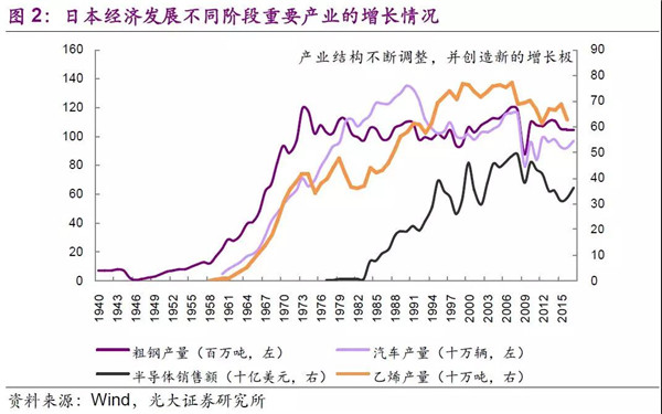 20世紀(jì)70年代起,尼克松沖擊、兩次石油危機(jī)以及廣場(chǎng)協(xié)議,致日本經(jīng)濟(jì)面臨較大的考驗(yàn)。1974年是日本經(jīng)濟(jì)第一個(gè)重要的分界點(diǎn),對(duì)于資源貧乏和市場(chǎng)狹窄的日本來(lái)說(shuō),期初人口及原材料廉價(jià)的優(yōu)勢(shì)已經(jīng)消失,只有通過(guò)產(chǎn)業(yè)結(jié)構(gòu)的升級(jí),發(fā)展節(jié)能和精細(xì)化高附加值的產(chǎn)品,才能實(shí)現(xiàn)日本企業(yè)競(jìng)爭(zhēng)力進(jìn)一步提升。在此期間,日本汽車、半導(dǎo)體產(chǎn)業(yè)的騰飛便是一個(gè)很好的例子,新的增長(zhǎng)極的出現(xiàn),也將石油危機(jī)、資源約束的影響降到較低的水平。