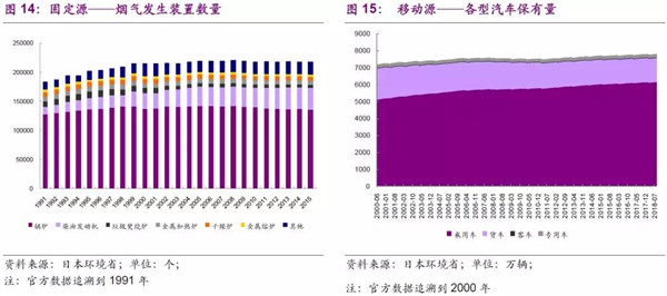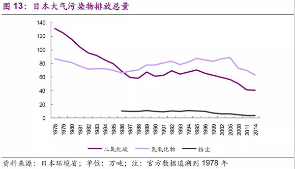 從大氣污染排放總量上來(lái)看,日本20世紀(jì)70-80年代二氧化硫排放總量快速下降,這與期間法律法規(guī)的完善,煙氣脫硫力度增加有很大關(guān)系,而且治理效果很明顯,說(shuō)明一般固定排放源安裝脫硫設(shè)施便可以達(dá)到較好的效果。