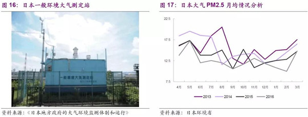 環(huán)境質(zhì)量監(jiān)測(cè)方面,以大氣監(jiān)測(cè)為例,日本分為一般環(huán)境大氣測(cè)定站、汽車尾氣測(cè)量站:2016年,日本全國(guó)范圍內(nèi)二氧化氮測(cè)定站共1636個(gè)(1243+393,一般+尾氣,下同)、SPM測(cè)定站共1684個(gè)(1296+388)、光化學(xué)氧化劑OX測(cè)定站共1172個(gè)(1143+29)、二氧化硫測(cè)定站共1008個(gè)(957+51)、一氧化碳測(cè)定站共285個(gè)(57+228)、PM2.5測(cè)定站共1008個(gè)(785+223)。