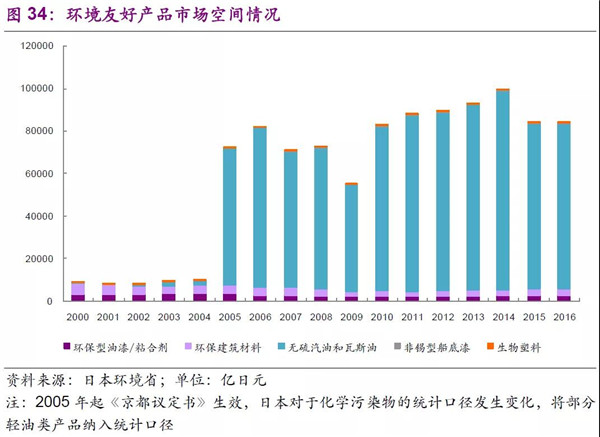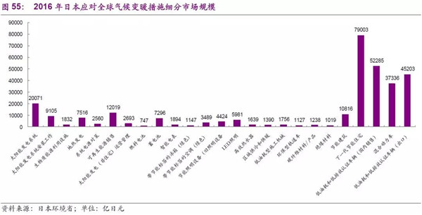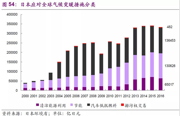 在日本應(yīng)對(duì)全球氣候變暖措施分類上,主要有清潔能源利用、節(jié)能、汽車低耗燃料等具體措施,2016年整體的市場(chǎng)空間可以達(dá)33萬(wàn)億日元(日本環(huán)境省數(shù)據(jù))。具體細(xì)分來(lái)看,以2016年為例,節(jié)能建筑、低油耗低排放及混合動(dòng)力車輛、太陽(yáng)能產(chǎn)業(yè)、蓄電池、節(jié)能照明設(shè)施等是未來(lái)重要的發(fā)展方向。