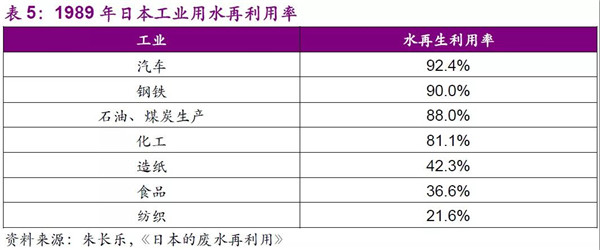 日本工業(yè)用水消耗量隨工業(yè)化發(fā)展迅速提升,1989年工業(yè)水消耗量達(dá)到1.44億立方米/日,耗水大戶為化工、鋼鐵、造紙,占總量約70%左右。1965年工業(yè)水的再利用率僅為36%,日本從改革生產(chǎn)工藝入手,盡量采用資源利用率高、污染物排放量少的先進(jìn)工藝,最大限度地利用水資源,使得再利用率在1975年達(dá)到67%、1989年進(jìn)一步達(dá)到76%;行業(yè)方面,汽車、石油、煤炭工業(yè)和化學(xué)工業(yè)都具有高水再生利用率,而紡織、食品、造紙工業(yè)的水再生利用率較低,原因在于前者冷卻、空調(diào)等用水易于回收,而后者常為洗滌用水,較難以處理。(朱長(zhǎng)樂(lè),《日本的廢水再利用》)
