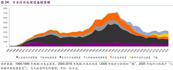 從污水處理市場(chǎng)空間分析:工業(yè)污水設(shè)備的需求體現(xiàn)了工業(yè)化以及法規(guī)發(fā)展過(guò)程,日本的工業(yè)污水處理市場(chǎng)在70年代達(dá)到一個(gè)高峰,后期相對(duì)平穩(wěn);而生活污水處理設(shè)備及市政設(shè)施建設(shè)則與城鎮(zhèn)化、房地產(chǎn)周期以及法規(guī)發(fā)展過(guò)程相關(guān),日本的生活污水處理市場(chǎng)則在20世紀(jì)90年代中后期達(dá)到高峰;海洋污染防治在2011年開(kāi)始受重視,設(shè)備需求在逐步提升的過(guò)程中。