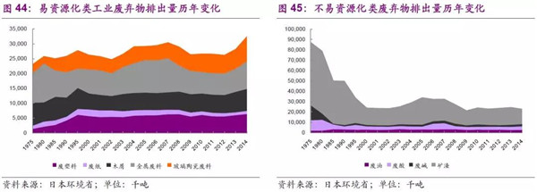 以易資源化和不易資源化來(lái)劃分工業(yè)垃圾產(chǎn)生量:易資源化廢棄物主要隨著日本工業(yè)化和城鎮(zhèn)化興起而產(chǎn)量增加,同時(shí)即便在經(jīng)濟(jì)周期的下行周期,其變化也并不是很顯著;而不易資源化的工業(yè)垃圾如部分重工業(yè)產(chǎn)生的廢酸、廢堿、礦渣等排出量卻會(huì)隨著經(jīng)濟(jì)周期的下行發(fā)生一定幅度的減少。這也說(shuō)明在20世紀(jì)80年代后期,日本的產(chǎn)業(yè)結(jié)構(gòu)正逐漸發(fā)生著變化,傳統(tǒng)的重污染行業(yè)正在逐漸減少或進(jìn)行節(jié)能環(huán)保轉(zhuǎn)型、新興產(chǎn)業(yè)正在興起。