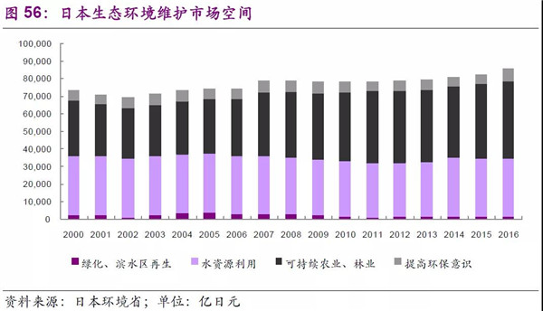 日本的生態(tài)維護(hù)市場(chǎng)主要是面向自然資源的維護(hù),主要體現(xiàn)在水資源利用和可持續(xù)發(fā)展農(nóng)業(yè)和林業(yè)。市場(chǎng)空間方面,2016年綠化、濱水區(qū)再生為1781億日元、水資源利用3.3萬(wàn)億日元、可持續(xù)農(nóng)業(yè)及林業(yè)為4.4萬(wàn)億日元、提高環(huán)保意識(shí)措施為6793億日元。