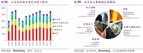 公司從1884年秋田縣小坂礦山起步,逐步發(fā)展到從金屬的生產(chǎn)開(kāi)始到高附加價(jià)值產(chǎn)品的制造、以及廢棄物的處理及循環(huán)利用,開(kāi)展著特有的循環(huán)型事業(yè)活動(dòng),這也契合了當(dāng)前日本綠色發(fā)展的產(chǎn)業(yè)要求。公司目前共有五大服務(wù)領(lǐng)域:環(huán)保與循環(huán)再生、冶煉、電子材料、金屬加工、以及熱處理,2018年?duì)I業(yè)收入達(dá)4548億日元,各業(yè)務(wù)營(yíng)業(yè)收入占比相對(duì)穩(wěn)定,其發(fā)家的冶煉業(yè)務(wù)營(yíng)業(yè)收入占比常年保持在40%以上。