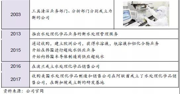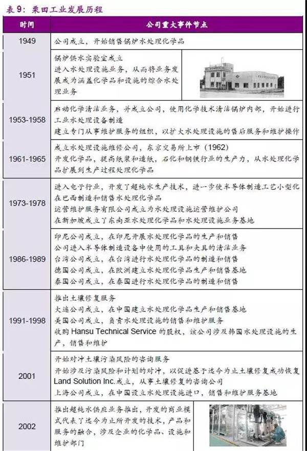 公司起步于鍋爐清洗化學(xué)品銷售,在成立早期雖經(jīng)歷一定坎坷,但最終公司的技術(shù)和產(chǎn)品逐漸被市場(chǎng)認(rèn)可,成為市場(chǎng)的主導(dǎo)產(chǎn)品。伴隨日本工業(yè)化進(jìn)程發(fā)展,1953年后公司的業(yè)務(wù)范圍不僅局限于化學(xué)品產(chǎn)品,也開(kāi)始進(jìn)入設(shè)備領(lǐng)域,尤其是在水處理設(shè)備市場(chǎng),如:離子交換樹(shù)脂、水軟化及純水設(shè)備是公司具有核心競(jìng)爭(zhēng)力的產(chǎn)品。公司通過(guò)不斷學(xué)習(xí)并獲取過(guò)濾設(shè)備、流量控制等多項(xiàng)技術(shù),逐步確立了鍋爐水供應(yīng)的市場(chǎng)地位。