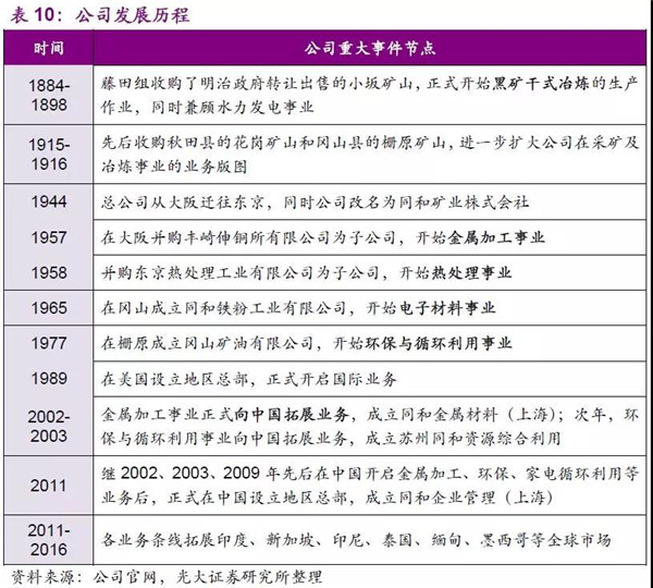 同和控股的歷史可以追溯到1884年,當(dāng)時(shí)藤田組收購(gòu)了政府轉(zhuǎn)讓出售的秋田縣小坂礦山后,從采礦及冶煉事業(yè)開(kāi)始起步,先是通過(guò)不斷的收購(gòu)礦山壯大其在采礦及冶煉事業(yè)的業(yè)務(wù),隨后抓住時(shí)代變遷的機(jī)遇,先后涉獵金屬加工、熱處理、電子材料、以及環(huán)保等其他領(lǐng)域,目前已形成了由五大核心事業(yè)部構(gòu)成的有著“產(chǎn)—供—銷—收”全過(guò)程產(chǎn)業(yè)鏈的循環(huán)性事業(yè)。