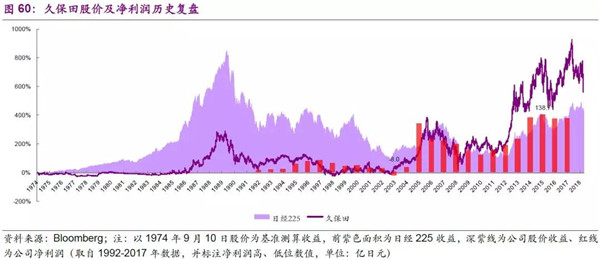 我們對(duì)公司1974-2018年的股價(jià)及凈利潤(rùn)進(jìn)行了復(fù)盤。公司作為的全球農(nóng)業(yè)機(jī)械和環(huán)境領(lǐng)域設(shè)備制造商,受經(jīng)濟(jì)周期性影響較為顯著,具有典型的周期股屬性。公司上市后的早期階段持續(xù)跑輸大盤,在20世紀(jì)80年代末資產(chǎn)泡沫階段,表現(xiàn)也較為低迷;2003-2007年全球經(jīng)濟(jì)繁榮,尤其是中國(guó)和北美的業(yè)務(wù)帶動(dòng)公司業(yè)務(wù)進(jìn)一步發(fā)展,公司業(yè)績(jī)穩(wěn)步提升(2005年的業(yè)績(jī)提升主要系收到了586億日元養(yǎng)老金替代計(jì)劃的政府補(bǔ)助),股票開(kāi)始獲得超額收益;隨后受次貸危機(jī)影響,公司股價(jià)隨業(yè)績(jī)同步走低,直到2012年后日元貶值至出口轉(zhuǎn)好,疊加全球經(jīng)濟(jì)回暖北美和東南亞銷售回暖,公司在2013-2014年的業(yè)績(jī)才顯著轉(zhuǎn)好;此后公司股價(jià)隨日本股市整體上漲,表現(xiàn)優(yōu)異至今。