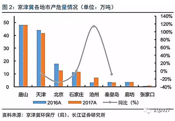 京津冀地區(qū)受到供給側(cè)改革影響預(yù)計(jì)產(chǎn)業(yè)轉(zhuǎn)移規(guī)劃[1],總體空間有限,河北空間相對(duì)明顯:近三年的危廢產(chǎn)量呈現(xiàn)遞減趨勢(shì),預(yù)計(jì)未來(lái)京津冀的危廢增量趨于平緩,區(qū)域總體增量空間有限。相對(duì)而言,基于十三五規(guī)劃目標(biāo)(新增能力3.3倍),河北省的危廢市場(chǎng)存在一定的市場(chǎng)空間,但總體依然有限,未來(lái)的處置重點(diǎn)為廢酸、制藥行業(yè)廢菌渣。