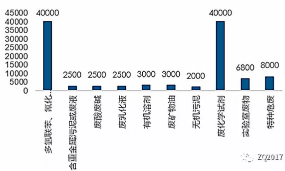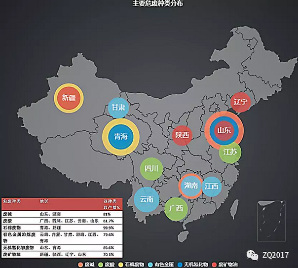 截止2017年底,我國(guó)危廢的產(chǎn)量達(dá)到6936.89萬(wàn)噸,盡管我國(guó)2017年底核準(zhǔn)的危廢生產(chǎn)資質(zhì)規(guī)模達(dá)到8178萬(wàn)噸/年,但實(shí)際的處理規(guī)模僅僅占危廢產(chǎn)量的1/3,缺口龐大。從地區(qū)來(lái)看,我國(guó)的工業(yè)危廢主要集中在京津冀-山東、長(zhǎng)三角、遼沈一帶、西南重工業(yè)區(qū)等地域,其中山東、江蘇、湖南、浙江、內(nèi)蒙古、四川、廣東、廣西、吉林和新疆的危廢產(chǎn)量之和占上報(bào)總量的1/3。根據(jù)廣發(fā)證券分析,目前處理缺口比較大大的區(qū)域包括山東、湖南、青海以及新疆一帶。