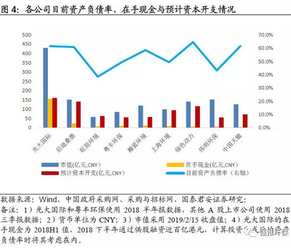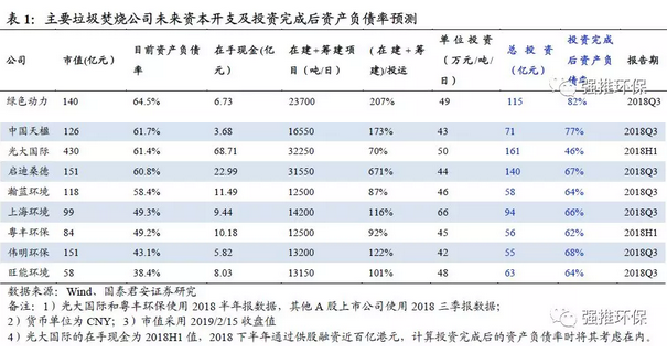 我們測算,存量項(xiàng)目達(dá)產(chǎn)后,9家垃圾焚燒重點(diǎn)上市公司平均資產(chǎn)負(fù)債率提升至66%。目前主要垃圾焚燒上市公司資產(chǎn)負(fù)債率平均為54%,在手現(xiàn)金與市值之比平均為12%:1)A股公司采用2018年三季報(bào)數(shù)據(jù),港股公司采用2018年半年報(bào)數(shù)據(jù);所有貨幣單位統(tǒng)一為CNY。2)目前資產(chǎn)負(fù)債率:各公司平均值為54%,目前旺能環(huán)境最低(38.4%),綠色動力最高(64.5%),光大國際2018H1為61%,考慮供股融資后,資產(chǎn)負(fù)債率將下降為55%。3)在手現(xiàn)金:各公司在手現(xiàn)金與市值之比平均值為12%,光大國際在手現(xiàn)金最為充沛,遠(yuǎn)高于行業(yè)平均水平。