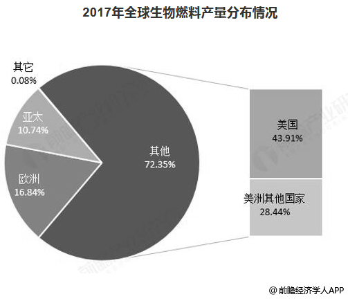 從2017年全球各區(qū)域生物燃料產(chǎn)量分布來看,主要集中在以美國(guó)為主的美洲國(guó)家,2017年達(dá)到了6085.9萬噸當(dāng)油量,全球占比達(dá)72.35%。其中美國(guó)2017年生物燃料產(chǎn)量為3693.6萬噸當(dāng)油量,占全球的43.91%,占美洲的60.69%;2017年歐洲國(guó)家生物燃料產(chǎn)量1416.7萬噸當(dāng)油量,占全球的16.84%。此外亞太地區(qū)為903.1萬噸當(dāng)油量,占比10.74%。