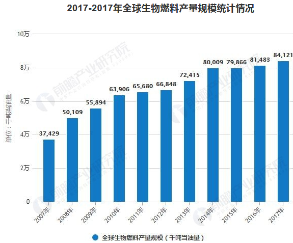 隨著全球大規(guī)模、大范圍的發(fā)展生物質(zhì)能發(fā)電,生物燃料生物燃料產(chǎn)量規(guī)模也實(shí)現(xiàn)的迅速的增長(zhǎng)。數(shù)據(jù)顯示,2007年全球生物燃料產(chǎn)量為3742.9萬噸當(dāng)油量,至2017年上升至8412.1萬噸當(dāng)油量,2008-2017年復(fù)合增長(zhǎng)率達(dá)8.43%。