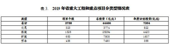 2019年共安排省重大工程和重點項目2738個,總投資44466億元,2019年計劃投資7204億元。其中:收尾項目323個,總投資3774億元,年度計劃投資822億元;續(xù)建項目1326個,總投資25294億元,年度計劃投資4420億元;新建項目653個,總投資7908億元,年度計劃投資1607億元;預備項目436個,總投資7490億元,年度計劃投資355億元。