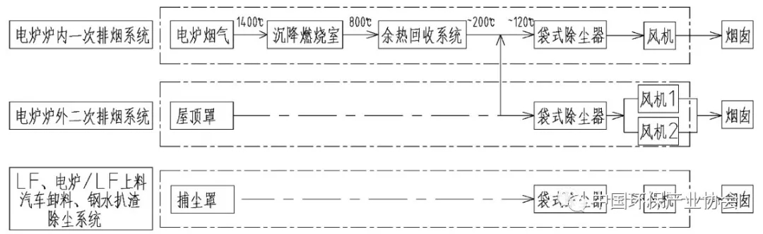 電爐爐內(nèi)排煙經(jīng)余熱鍋爐回收余熱降溫后經(jīng)袋式除塵器除塵達標排放;采用“半密閉導流煙罩+屋頂貯留集塵罩+鐵水溜槽排煙罩”相結合的方式全過程捕集電爐在加廢鋼、兌鐵水、熔煉、出鋼等過程中產(chǎn)生的排煙,煙氣在半密閉導流煙罩及鐵水溜槽排煙罩導流作用下流經(jīng)屋頂貯留集塵罩,再經(jīng)袋式除塵器除塵達標排放;采用爐內(nèi)一次排煙和爐外移動半密閉罩二次排煙相結合的方式捕集鋼包電弧爐煙氣,經(jīng)袋式除塵器除塵達標排放。