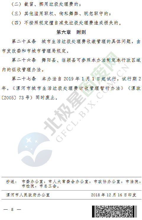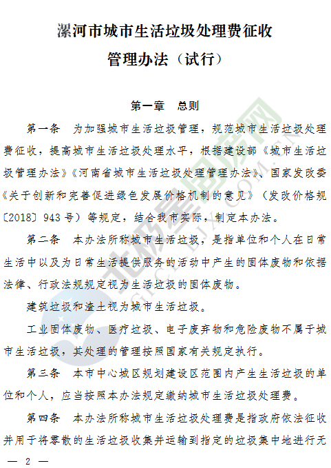 日前,《漯河市城市生活垃圾處理費(fèi)征收管理辦法(試行)》已經(jīng)河南漯河市政府第36次常務(wù)會(huì)議研究通過(guò),并于2019年1月1日起試行。《漯河市城市生活垃圾處理費(fèi)征收管理辦法(試行)》是對(duì)《漯河市城市生活垃圾處理費(fèi)計(jì)收管理暫行辦法》(漯政〔2005〕73號(hào))的完善修訂。