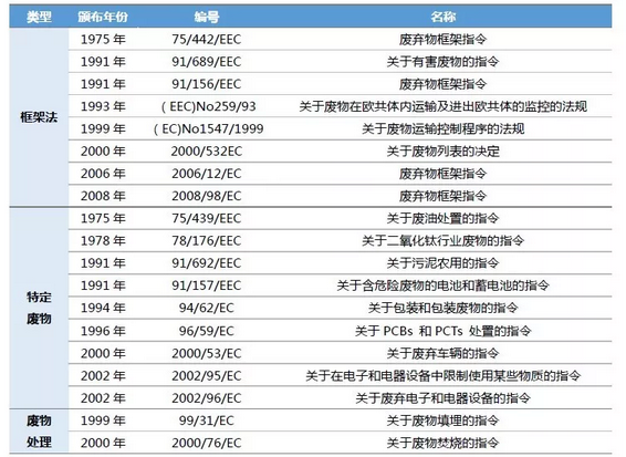 歐盟通過廢棄物框架指令確立了固廢處理的理念,建立了固廢處理體系,其相關(guān)的環(huán)境法律政策實(shí)際由兩部分組成,一部分是各類指令,從法律上直接對各成員國起約束作用,另一部分是定期頒布的環(huán)境行動規(guī)劃,對各成員國進(jìn)行目標(biāo)、內(nèi)容上的指導(dǎo)。