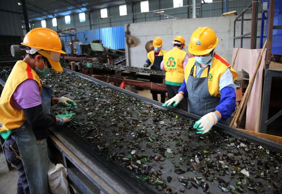△白云區(qū)玻璃回收處理中心:回收的廢棄玻璃制品通過機(jī)器進(jìn)行破碎清洗后,工作人員在進(jìn)行精細(xì)分揀工序,將金屬蓋、塑料蓋徹底分離出來
