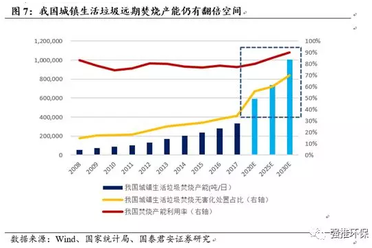 近期看,根據(jù)“十三五”規(guī)劃,我們測算2020年我國城鎮(zhèn)生活垃圾焚燒處理率將達56%。我們假設,1)2020年末我國城鎮(zhèn)生活垃圾產(chǎn)能達到“十三五”規(guī)劃數(shù)據(jù),2)2018-2020年城市及縣城垃圾清運量分別按照每年5%、1.5%的速度增長,3)2018-2020年城市及縣城垃圾無害化處置率分別保持98%、91%,4)到2020年城鎮(zhèn)生活垃圾焚燒產(chǎn)能利用率達到80%,則可測算出到2020年我國城鎮(zhèn)生活垃圾焚燒處理率將達56%。
