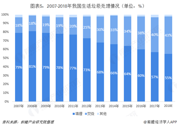 從歷史上看,填埋雖一直是主流模式,但近年來(lái),填埋處理的垃圾占比持續(xù)下降,從2010年的78%下降至2017年的57%,2018年約下降至55%。
