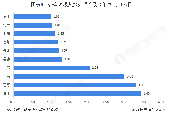 目前,國(guó)內(nèi)的垃圾焚燒發(fā)電廠主要分布在經(jīng)濟(jì)發(fā)達(dá)地區(qū)和一些大城市。從垃圾焚燒產(chǎn)能角度看,浙江、江蘇、廣東三省垃圾焚燒產(chǎn)能超過(guò)3萬(wàn)噸/日,其中浙江省生活垃圾焚燒發(fā)電廠數(shù)量最多,垃圾焚燒處理產(chǎn)能最大。
