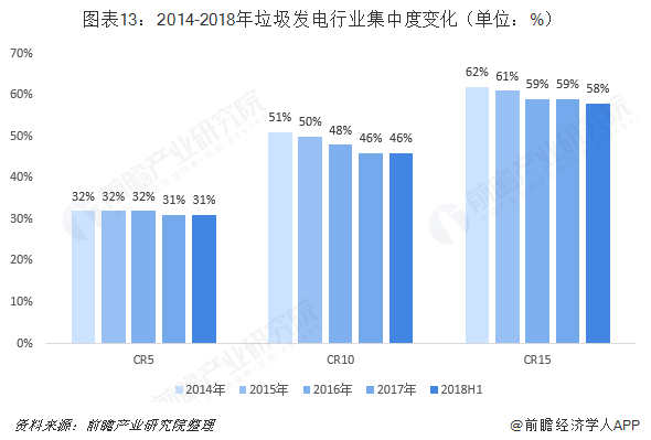 從行業(yè)整體來(lái)看,我國(guó)垃圾發(fā)電行業(yè)集中度較高,不過(guò)近年來(lái)趨于下滑。從存量已投運(yùn)產(chǎn)能市占率看,CR5在2014年-2018H1基本維持在31%-32%,CR10由2014年的51%下降至2018H1的46%,CR15由2014年的51%下降至2018H1的46%。