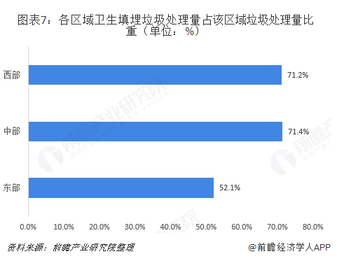 在垃圾無(wú)害化處理方面,我國(guó)各地區(qū)填埋處理占生活垃圾無(wú)害化比例保持著東低中西高的趨勢(shì),東部、中部和西部地區(qū)的生活垃圾填埋處理占無(wú)害化比例分別為52.1%、71.4%和71.2%。