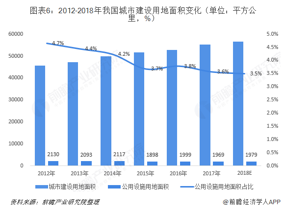 根據(jù)2019年1月住建部公布的《2017年城鄉(xiāng)建設(shè)統(tǒng)計(jì)年鑒》,2017年全國(guó)城市建設(shè)用地面積達(dá)到55155.5平方公里,其中市政公用基礎(chǔ)設(shè)施用地面積為1969平方公里,占比僅為3.6%,預(yù)計(jì)2018年將進(jìn)一步下降。
