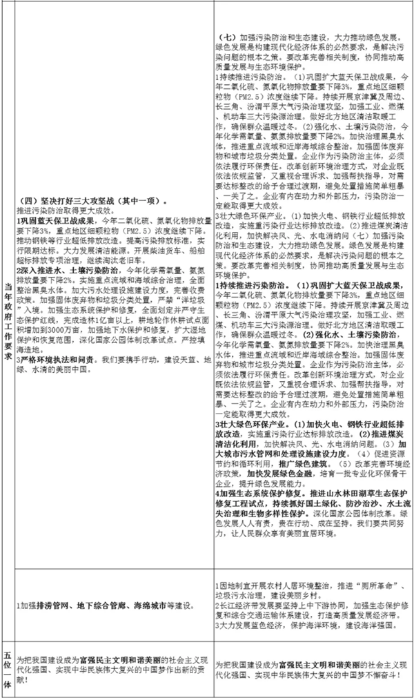 原文:“持續(xù)推進污染防治。鞏固擴大藍天保衛(wèi)戰(zhàn)成果,今年二氧化硫、氮氧化物排放量要下降3%,重點地區(qū)細顆粒物(PM2.5)濃度繼續(xù)下降。持續(xù)開展京津冀及周邊、長三角、汾渭平原大氣污染治理攻堅,加強工業(yè)、燃煤、機動車三大污染源治理。做好北方地區(qū)清潔取暖工作,確保群眾溫暖過冬。強化水、土壤污染防治,今年化學需氧量、氨氮排放量要下降2%。加快治理黑臭水體,推進重點流域和近岸海域綜合整治。加強固體廢棄物和城市垃圾分類處置。企業(yè)作為污染防治主體,必須依法履行環(huán)保責任。改革創(chuàng)新環(huán)境治理方式,對企業(yè)既依法依規(guī)監(jiān)管,又重視合理訴求、加強幫扶指導,對需要達標整改的給予合理過渡期,避免處置措施簡單粗暴、一關了之。企業(yè)有內(nèi)在動力和外部壓力,污染防治一定能取得更大成效?!?/p>