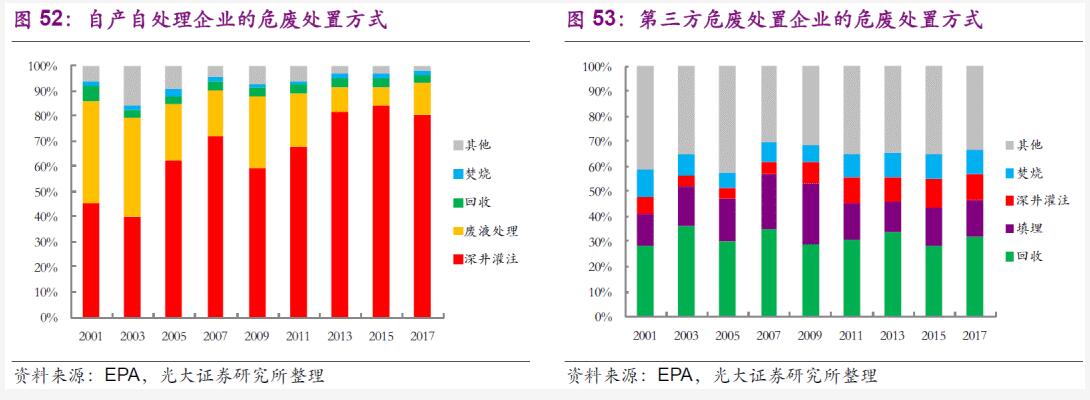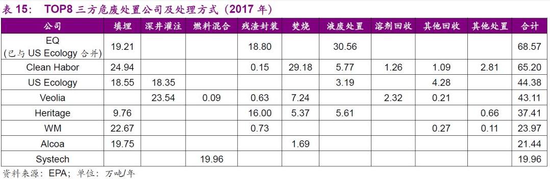 (2)第三方處理比例較低。在1990年后,政府對危廢的監(jiān)管進(jìn)一步趨嚴(yán),單純的通過第三方處置對于有大量危廢產(chǎn)出的企業(yè)來說成本過高,加上危廢處理技術(shù)的進(jìn)一步成熟,促使眾多大型化工企業(yè)采用自行處理危廢的方式消納危廢產(chǎn)出。從2001年起,美國危廢的場外處理量(Waste received from off-Site,即接收從場外運(yùn)送進(jìn)處理廠內(nèi)的危廢,基本等同于第三方處置量)常年低于20%,在危廢產(chǎn)量基本穩(wěn)定的情況下,第三方處置危廢企業(yè)可以分到的蛋糕其實(shí)十分有限,這也激發(fā)了危廢處置企業(yè)開拓新業(yè)務(wù)的需求。