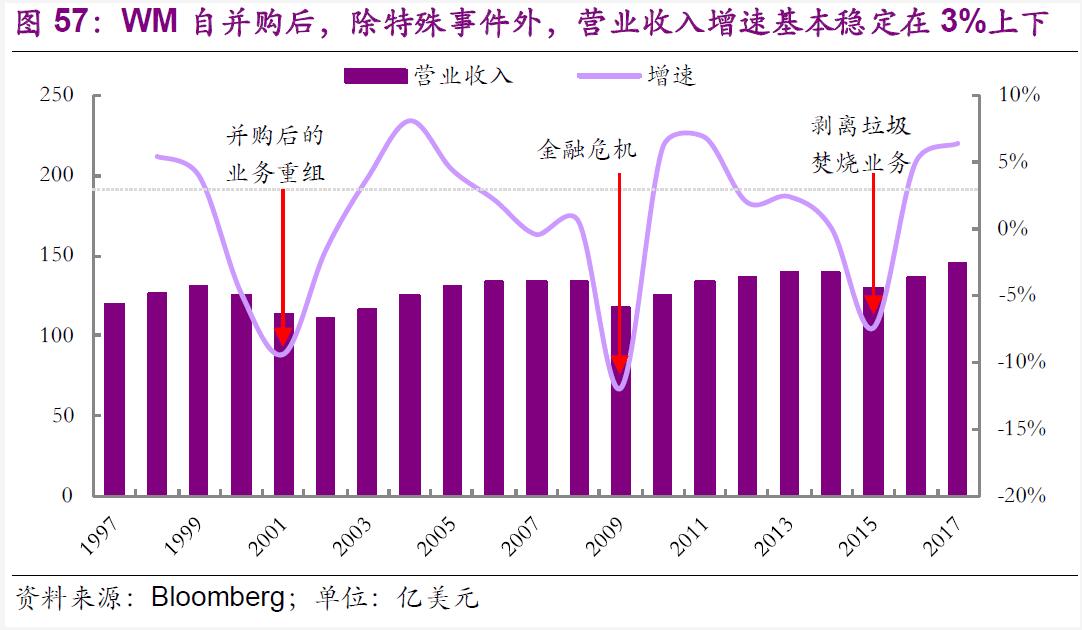 外因內(nèi)策聯(lián)動,助力公司發(fā)展。外因方面,美國居民消費(fèi)支出增長帶動固廢產(chǎn)生量從1960年的560萬噸提升到1990年的2.08億噸;1970年前后,《固體廢物處置法》等法規(guī)的出臺催化行業(yè)向規(guī)范化標(biāo)準(zhǔn)化成長;固廢處置的成熟技術(shù)發(fā)展為固廢綜合管理提供有力支撐,而環(huán)保意識的逐漸完善則成為行業(yè)資源化、精細(xì)化處理轉(zhuǎn)型的決定性因素,帶動美國垃圾填埋處理占比從1960年的90%以上下降至2010年的54%,回收利用處理占比則從1960年的6%提升到2010年的34%。內(nèi)策方面,在對的時機(jī)采取對的兼并收購策略,先是幫助WM在行業(yè)高速發(fā)展階段通過140余次收購搶占市場份額,成為行業(yè)龍頭;在改變公司歷史的1998年的WM/UW合并后,又通過數(shù)十次大體量的核心業(yè)務(wù)收購進(jìn)一步穩(wěn)固公司市場份額,以及數(shù)十次專業(yè)化新業(yè)務(wù)的收購?fù)瓿尚屡d業(yè)務(wù)開拓轉(zhuǎn)型,帶動公司實(shí)現(xiàn)新一輪騰飛。