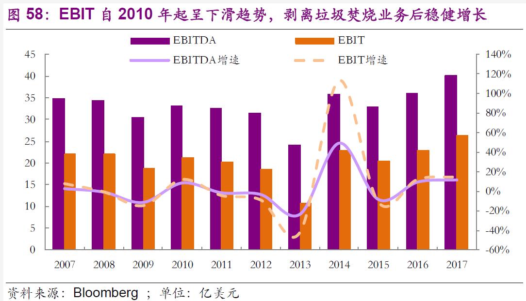 公司2017年垃圾處理量高達(dá)1.13億噸,實(shí)現(xiàn)營業(yè)收入145億美元,EBIT和EBITDA分別為26和40億美元。公司2017年固廢營業(yè)收入居全球第一,領(lǐng)先第二名威立雅達(dá)70%,而這一切都建立在公司僅在美國和加拿大運(yùn)營的基礎(chǔ)上,充分展現(xiàn)出公司在固廢領(lǐng)域的絕對統(tǒng)治力。