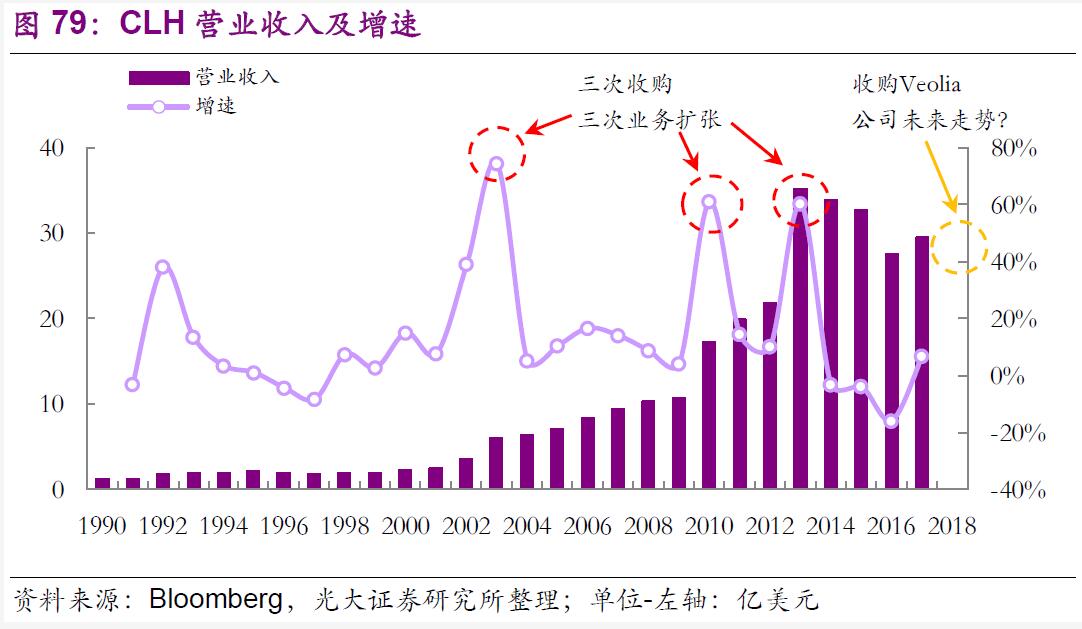 公司在成立后的近40年里,通過大大小小近40余次外延并購,在增加危險廢物處理設(shè)施的數(shù)量和覆蓋區(qū)域、擴(kuò)大業(yè)務(wù)服務(wù)范圍的同時,也致力于增添新的涵蓋多個行業(yè)和業(yè)務(wù)類型的服務(wù)領(lǐng)域、擴(kuò)大服務(wù)種類,最終從一家小型油罐清潔公司成長為北美領(lǐng)先的環(huán)境和工業(yè)服務(wù)提供商和最大的危險廢物處理公司。