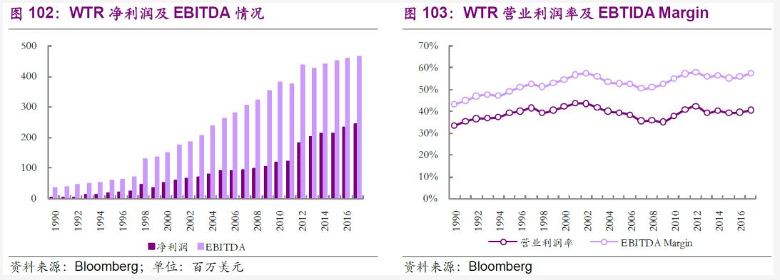 我們對WTR股價進(jìn)行了復(fù)盤,為了較為明顯的展示收益特點(diǎn),我們將其分為3個階段,第一階段,公司開始大規(guī)模的并購且進(jìn)入收入和凈利潤快速增長期,此階段,公司較好的跑贏指數(shù);第二階段2000-2009年,公司營業(yè)收入和凈利潤增長為2.48和1.95倍,這個階段是公司成長最快的階段,股價最高峰漲幅接近3.5倍,雖然后受金融危機(jī)影響,但該過程實(shí)現(xiàn)了較多的超額收益;第三階段,由于前期股價漲幅較快公司估值并不具備優(yōu)勢,雖也體現(xiàn)了水務(wù)公司的公用事業(yè)屬性,漲幅雖然較好但未跑贏指數(shù)。